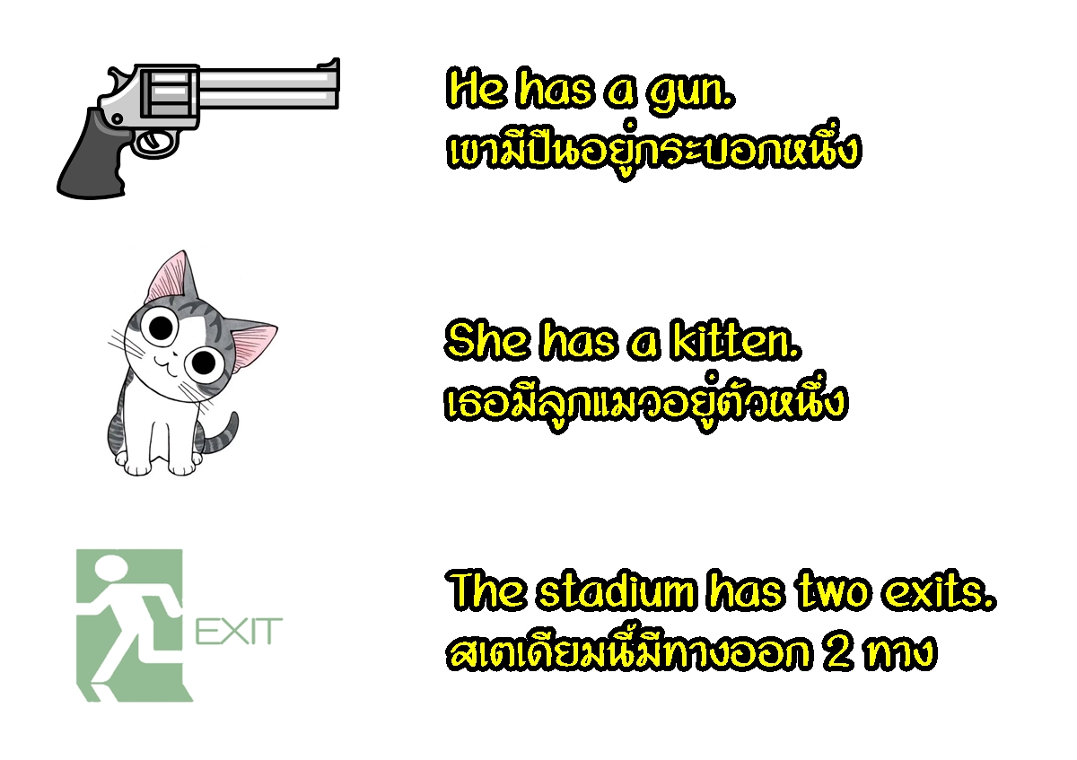 ไวยากรณ์ภาษาอังกฤษ การใช้งาน verb to have (ภาคปัจจุบัน) พฤศจิกายน 7, 2017by Sine1 min read Written by Sine verb to have เป็นกริยากลุ่มหนึ่งที่ใช้บอกว่า ปประธานมี verb to have เมื่อกล่าวถึงเหตุการณ์ในปัจจุบัน มีอยู่ 2 ตัวคือ have และ has จะเลือกใช้ตัวไหนนั้นให้ดูที่ประธาน